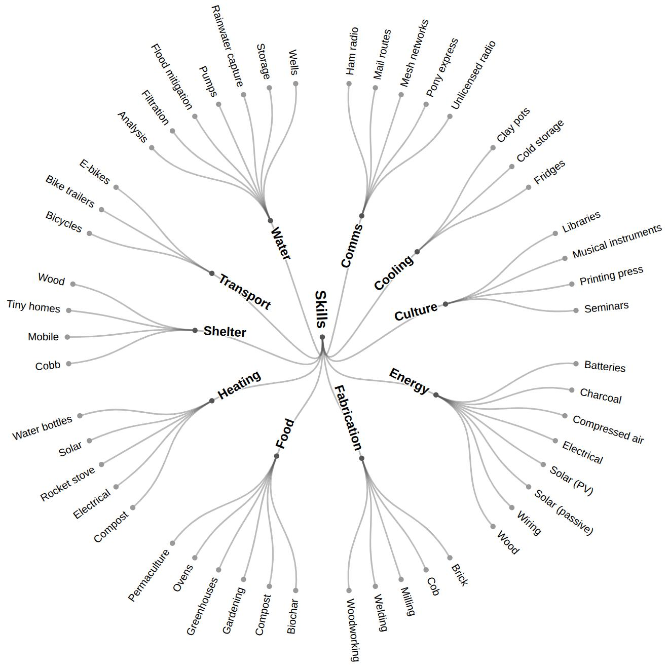 In parallel, otherWise advisor and community member Greg Nelson is in the process of developing a reSkilling Taxonomy that identifies and organizes the nuts‑and‑bolts skills commonly needed in a low-tech village. The taxonomy is organized into layers: what most people can do, what some people specialize in, and what a few carry between places when needed. It can be used to inventory real capacities in a community – who can cook for a crowd, fix a pump, butcher an animal, teach first aid – grouped by basic, advanced, and mobile skill levels so nothing essential depends on just one person. Or it can serve as a framework for organizing knowledge or creating a syllabus for an informal School of reSkilling.